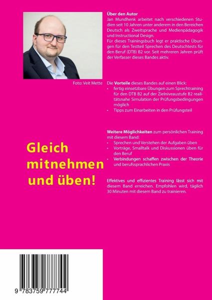 Die Vorteile dieses Bandes auf einen Blick: fertig einsetzbare Übungen zum Sprechtraining für den DTB B2 auf der Zielniveaustufe B2, realitätsnahe Simulation der Prüfungsbedingungen möglich und Tipps zum Einarbeiten in den Prüfungsteil. Weitere Möglichkeiten zum persönlichen Training mit diesem Band: Sprechen und Verstehen der Aufgaben üben, Vorträge, Smalltalk und Diskussionen üben für den Beruf und Verbindungen schaffen zwischen der Theorie und berufssprachlichen Praxis. Effektives und effizientes Training lässt sich mit diesem Band erreichen. Empfohlen wird, täglich 30 Minuten mit diesem Band zu trainieren.