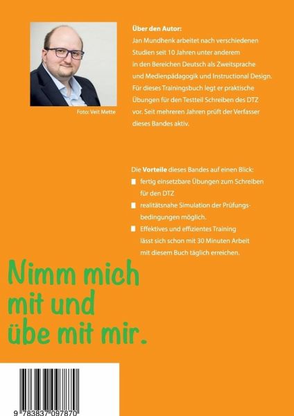 Jan Mundhenk arbeitet nach verschiedenen Studien seit 10 Jahren unter anderem in den Bereichen Deutsch als Zweitsprache und Medienpädagogik und Instructional Design. Für dieses Trainingsbuch legt er praktische Übungen für den Testteil Schreiben des DTZ vor. Seit mehreren Jahren prüft der Verfasser dieses Bandes aktiv.