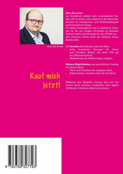 Die Vorteile dieses Bandes auf einen Blick: Übungen zur Vorbereitung auf den Teil Lesen und Schreiben des DTB B2, vielfältige Anregungen zum Üben für die verschiedenen Schwierigkeiten des Knackens der Übungen. Weitere Möglichkeiten zum Einsatz dieses Bandes im Überblick: Aufgaben lesen und verstehen üben, mit Texten das Schreiben an Kunden üben und wichtige Inhalte schnell erschließen, Aufgaben in einer Simulation des Tests üben, Anregungen für Zwischentests und zeitsparende Dokumentation der Zwischentests. Optimal ist das tägliche Üben für 20-30 Minuten mit diesem Trainingsbuch.