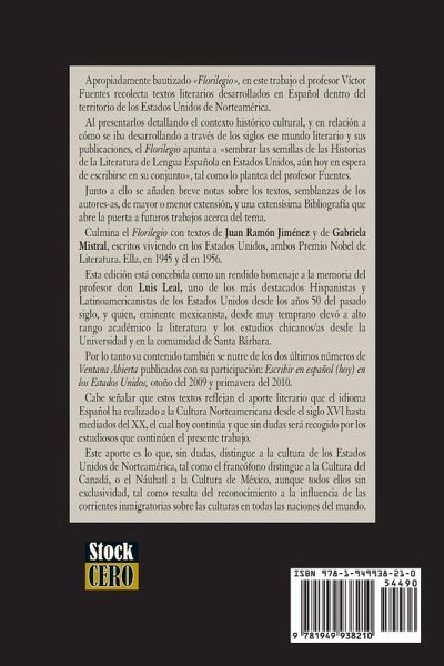 Properly named "Florilegio" (flower picking), in this work Professor Víctor Fuentes collects literary texts written in Spanish within the territory of the United States of America.Presenting them along details of the cultural historical context, and how that literary world and its publications developed through the centuries, this "florilegio" aims to "sow the seeds of a History of the Spanish Language Literature in the United States, waiting to be written", in Professor Fuentes' own words.Conceived as a tribute to the memory of Professor Don Luis Leal, one of the most prominent Hispanist and Latin Americanist in the United States since the 50s of the last century, and who, as an eminent Mexicanist, became an early advocate for the Literature and Chicano Studies from his position at the University, and within the Spanish speaking community in Santa Barbara, this Edition includes brief notes on the texts, semblances of the authors, and an extensive bibliography that opens the doors to future academic works on the subject.It should be noted that these texts reflect the literary contribution that the Spanish language has made to the American culture from the 16th to the mid -twentieth century, a contribution that continues today and that will undoubtedly be collected by the scholars who continue this work. The Spanish Language contribution is what, without a doubt, distinguishes the particular culture of the United States of America, in the same way the French Language contribution distinguishes the culture of Canada, or the Nauhatl the culture of Mexico, all of them without exclusivity, as it is indubitable the influence of all immigration currents upon cultures in all the nations of the world.