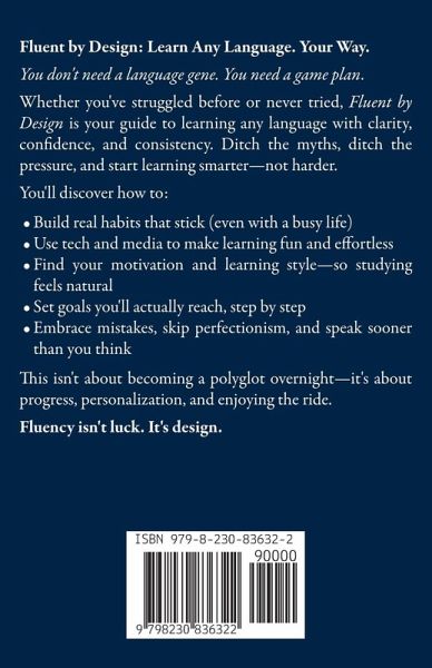 Fluent by Design: Learn Any Language. Your Way. You don't need a language gene. You need a game plan. Whether you've struggled before or never tried, Fluent by Design is your guide to learning any language with clarity, confidence, and consistency. Ditch the myths, ditch the pressure, and start learning smarter-not harder. You'll discover how to:Build real habits that stick (even with a busy life) Use tech and media to make learning fun and effortless Find your motivation and learning style-so studying feels natural Set goals you'll actually reach, step by step Embrace mistakes, skip perfectionism, and speak sooner than you think This isn't about becoming a polyglot overnight-it's about progress, personalization, and enjoying the ride. Fluency isn't luck. It's design.