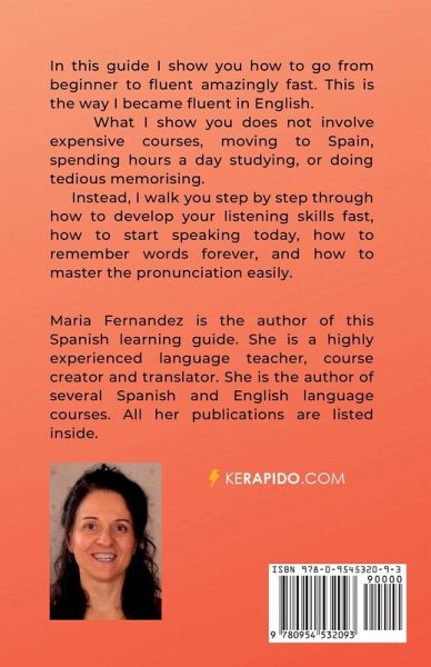 How do you learn Spanish fast? My students often ask me that question. That's why I wrote this short step-by-step guide. Here I show you how to go from beginner to fluent amazingly fast. What I show you does not involve expensive courses, moving to Spain, spending hours a day studying, or doing tedious memorising. Instead, I walk you step by step through how to develop your listening skills fast, how to start speaking today, how to remember words forever, and how to master the pronunciation easily. In just a few pages, I show you how to make the most of your limited time, and the time-wasting things to avoid. I also show you how to love your Spanish lessons, boost your motivation, and create an enjoyable daily learning habit. The tips in this short guide helped me become fluent in English, the language I now use in my career and daily life. Would you like to become fluent in Spanish fast? Get this guide now! About the author: I'm Maria Fernandez. I've been teaching Spanish, my mother tongue, for over twenty years. I've also taught myself several languages, including English. I wrote this short guide because I believe you can become fluent in Spanish fast, regardless of your age and background. My students have proved that to me over and over.
