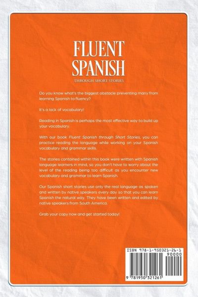 Do you know what's the biggest obstacle preventing many from learning Spanish to fluency? It's a lack of vocabulary! Reading in Spanish is perhaps the most effective way to build up your vocabulary. With our book Fluent Spanish through Short Stories, you can practice reading the language while working on your Spanish vocabulary and grammar skills. The stories contained within this book were written with intermediate Spanish language learners in mind, so you don't have to worry about the level of the reading being too difficult as you encounter new vocabulary and grammar to learn Spanish. Our Spanish short stories use only the real language as spoken and written by native speakers every day so that you can learn intermediate Spanish the natural way. They have been written and edited by native speakers from South America. Grab your copy now and get started today!