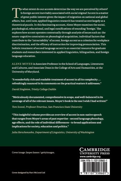To what extent do our accents determine the way we are perceived by others? Is a foreign accent inevitably associated with social stigma? Accent is a matter of great public interest given the impact of migration on national and global affairs, but until now, applied linguistics research has treated accent largely as a theoretical puzzle. In this fascinating account, Alene Moyer examines the social, psychological, educational and legal ramifications of sounding 'foreign'. She explores how accent operates contextually through analysis of issues such as: the neuro-cognitive constraints on phonological acquisition, individual factors that contribute to the 'intractability' of accent, foreign accent as a criterion for workplace discrimination, and the efficacy of instruction for improving pronunciation. This holistic treatment of second language accent is an essential resource for graduate students and researchers interested in applied linguistics, bilingualism and foreign language education.