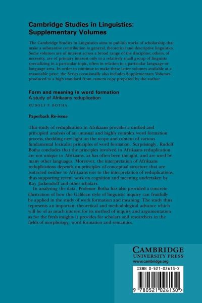 This study of reduplication in Afrikaans provides a unified and principled analysis of an unusual and highly complex word formation process, shedding new light on the scope and content of various fundamental lexicalist principles of word formation. Surprisingly, Rudolf Botha concludes that the principles involved in Afrikaans reduplication are not unique to Afrikaans, as has often been thought, and are used by many other languages. Moreover, the interpretation of Afrikaans reduplications depends on principles of conceptual structure that are restricted neither to Afrikaans nor to the interpretation of reduplications, thus supporting recent work on cognition and meaning undertaken by Ray Jackendoff and other scholars. In analysing the data, Professor Botha has also provided a concrete illustration of how the Galilean style of linguistic inquiry can fruitfully be applied in the study of word formation and meaning. The study thus represents an important theoretical and methodological advance which will be of as much interest for its method of inquiry and argumentation as for the fresh insights it provides for scholars and researchers in the fields of morphology, word formation and semantics.