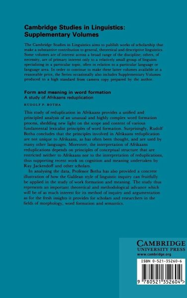 This study of reduplication in Afrikaans provides a unified and principled analysis of an unusual and highly complex word formation process, shedding new light on the scope and content of various fundamental lexicalist principles of word formation. Surprisingly, Rudolf Botha concludes that the principles involved in Afrikaans reduplication are not unique to Afrikaans, as has often been thought, and are used by many other languages. Moreover, the interpretation of Afrikaans reduplications depends on principles of conceptual structure that are restricted neither to Afrikaans nor to the interpretation of reduplications, thus supporting recent work on cognition and meaning undertaken by Ray Jackendoff and other scholars. In analysing the data, Professor Botha has also provided a concrete illustration of how the Galilean style of linguistic inquiry can fruitfully be applied in the study of word formation and meaning. The study thus represents an important theoretical and methodological advance which will be of as much interest for its method of inquiry and argumentation as for the fresh insights it provides for scholars and researchers in the fields of morphology, word formation and semantics.