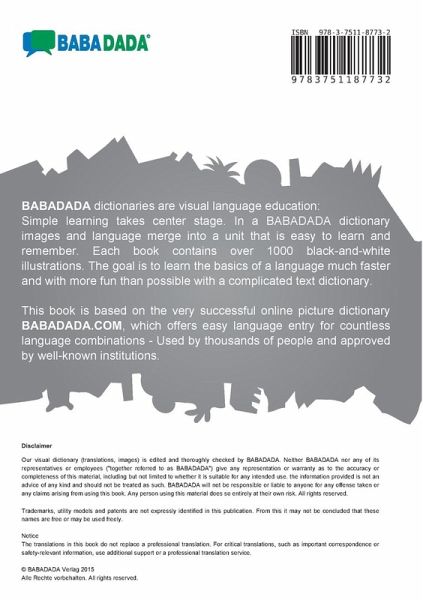 BABADADA dictionaries are visual language education: Simple learning takes center stage. In a BABADADA dictionary images and language merge into a unit that is easy to learn and remember. Each book contains over 1000 black-and-white illustrations. The goal is to learn the basics of a language much faster and with more fun than possible with a complicated text dictionary. This book is based on the very successful online picture dictionary BABADADA.COM, which offers easy language entry for countless language combinations - Used by thousands of people and approved by well-known institutions. The languages used in this book are also called as follows: Französisch, français, francés, francese, francês, Francuski