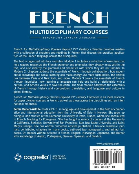 French for Multidisciplinary Courses Beyond 21st Century Literacies provides readers with a collection of chapters and readings in French that discuss the practical application of the French language across the disciplines. The text is organized into four modules. Module 1 includes a collection of exercises that help readers recognize the French grammar and phonetics they already know within the text, and also identify the grammar and phonetics with which they are not familiar. In Module 2, chapters address the essentials of French through collaboration, how experiential knowledge and social learning can make energy use more sustainable, the artistic link between Paris and New York, and more. Module 3 covers the essentials of French through linguistics, how learning a language can help one build a relationship with a culture, and African values to save the earth. The final module addresses the essentials of French through history and composition, translation, and language and culture in global literacy. French for Multidisciplinary Courses Beyond 21st Century Literacies is an ideal resource for upper division courses in French, as well as those across the disciplines with an international emphasis.