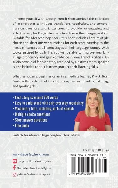 Do you struggle to find French reading material for beginners and intermediates? Look no further! Introducing French Short Stories! Improve your French with 30 easy French stories for beginners and intermediates. 30 short stories easily readable, covering everyday topics. The stories cover a variety of themes, including travel, friendship, family, and more. They are written in clear and concise language, making them easy to understand for beginners. The book also includes questions and answers for each story, allowing readers to test their comprehension and reinforce their understanding of the vocabulary. Read 1 story a day for 30 days and improve your French in only a month! French Short Stories has been written by a French teacher for French learners from beginner to intermediate level. Reading a story and answering the questions will take you less than 15 minutes a day. Each chapter includes: - A French short story easily readable with only 250 words and highlighted focused vocabulary to learn faster. - The English translation of each story. - Focused vocabulary including parts of speech, in French and in English. - Multiple choice questions for beginners. - Short answer questions for intermediate. But not only! At the end of the book, you will find a French-English glossary of all the highlighted vocabulary in the stories. Improve your listening skills Each story has been recorded in slow and clear French by a native French speaker (me). Download the audio of all the stories for free and start improving your French listening skills today. Grab your copy today and enjoy learning!