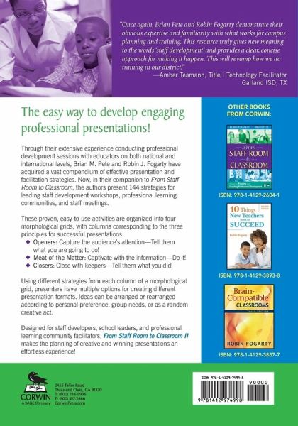 Acknowledgments About the Authors Introduction 1. Morph Grid I: Presentation and Facilitation Strategies 2. Morph Grid II: The Principal¿s Staff Meeting 3. Morph Grid III: Leading Professional Learning Communities 4. Morph Grid IV: Facilitating Group Work 5. Applying Interactive Strategies: The One-Minute Lesson Planner Appendix A: Index of Strategies Appendix B: Energizers References and Resources Index