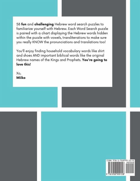 58 fun and challenging Hebrew word search puzzles to familiarize yourself with Hebrew. Each Word Search puzzle is paired with a chart displaying the Hebrew words hidden within the puzzle with vowels, transliterations to make sure you really KNOW the pronunciations and translations too! You'll enjoy finding household vocabulary words like shirt and shoes AND important biblical words like the original Hebrew names of the Kings and Prophets. You're going to love this!58 Puzzles. Learn over 900 words/ Charts - with Vowelized version, Transliteration and Translation to help you learn the words. Modern and Biblical Hebrew vocabulary. Thematic Puzzles - Each puzzle covers a category of words.