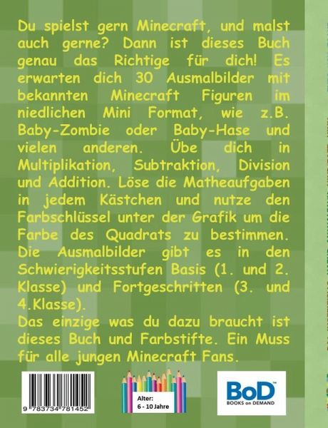 Achtung! Gleicher Inhalt wie die Minecraft Minis Bücher mit Enderdragon oder Zombie Cover.Altersempfehlung 6-10 Jahre.Du spielst gern Minecraft, und malst auch gerne? Dann ist dieses Buch genau das Richtige für dich! Es erwarten dich 30 Ausmalbilder mit bekannten Minecraft-Figuren im niedlichen Mini Format, wie z.B. Baby Zombie oder Baby Hase und vielen anderen. Übe dich in Multiplikation, Subtraktion, Division und Addition. Löse die Matheaufgaben in jedem Kästchen und nutze den Farbschlüssel unter der Grafik, um die Farbe des Quadrats zu bestimmen. Die Ausmalbilder gibt es in den Schwierigkeitsstufen Basis (1. und 2. Klasse) und Fortgeschritten (3. und 4.Klasse). Das Einzige, was du dazu brauchst, ist dieses Buch und Farbstifte. Ein Muss für alle jungen Minecraft Fans.