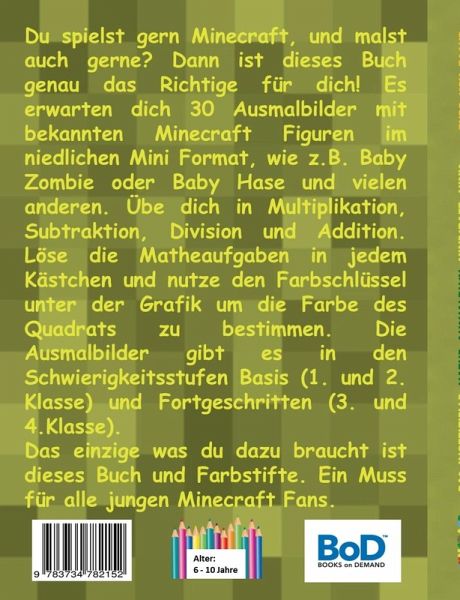 Achtung! Gleicher Inhalt wie Funcraft Minecraft Minis Bücher mit Enderdragon oder Hasen Cover.Du spielst gern Minecraft, und malst auch gerne? Dann ist dieses Buch genau das Richtige für dich! Es erwarten dich 30 Ausmalbilder mit bekannten Minecraft Figuren im niedlichen Mini Format, wie z.B. Baby Zombie, Baby Hase und vielen anderen. Übe dich in Multiplikation, Subtraktion, Division und Addition. Löse die Matheaufgaben in jedem Kästchen und nutze den Farbschlüssel unter der Grafik um die Farbe des Quadrats zu bestimmen. Die Ausmalbilder gibt es in den Schwierigkeitsstufen Basis (1. und 2. Klasse) und Fortgeschritten (3. und 4.Klasse). Das einzige was du dazu brauchst ist dieses Buch und Farbstifte. Ein Muss für alle jungen Minecraft Fans. Kein offizielles Minecraft-Produkt. Nicht von Mojang genehmigt oder mit Mojang verbunden.