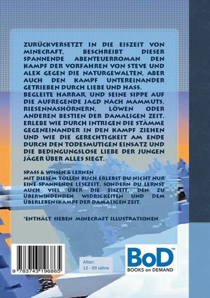 Zurückversetzt in die Eiszeit von Minecraft, beschreibt dieser spannende Abenteuerroman den Kampf der Vorfahren von Steve und Alex gegen die Naturgewalten, aber auch den Kampf untereinander, getrieben durch Liebe und Hass. Begleite Harrar und seine Sippe auf die aufregende Jagd nach Mammuts, Riesennashörnern, Löwen oder anderen Bestien der damaligen Zeit. Erlebe, wie durch Intrigen die Stämme gegeneinander in den Kampf ziehen und wie die Gerechtigkeit am Ende durch den todesmutigen Einsatz und die bedingungslose Liebe der jungen Jäger über alles siegt. Spaß & Wissen & LernenMit diesem tollen Buch erlebst du nicht nur eine spannende Lesezeit, sondern du lernst auch viel über die Eiszeit, den zu überwindenden Widrigkeiten und dem Überlebenskampf der damaligen Zeit._Enthält sieben Minecraft Illustrationen
