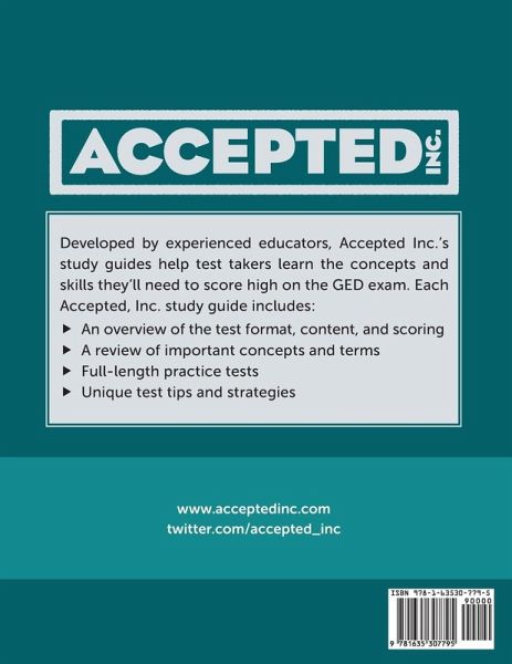 Updated for 2021, Accepted, Inc.'s unofficial GED Math Book 2020-2021: GED Preparation Study Guide with Practice Test Questions for the General Educational Development Mathematics Exam isn't like other study guides! Because we know you value your time, our unofficial study guide includes a quick yet full review of everything on the test with real examples, graphics, and information. Accepted, Inc.'s NEW GED Math Book 2020-2021 gives you the edge you need to score higher and pass the first time. General Educational Development was not involved in the creation or production of this product, is not in any way affiliated with Accepted, Inc., and does not sponsor or endorse this product. Accepted, Inc.'s GED Math Book 2020-2021 offers: * A full review of what you need to know for the GED exam * Practice questions for you to practice and improve * Test tips and strategies to help you score higher Accepted Inc.'s GED Math Book 2020-2021 covers: * Numbers and Operation * Algebra * Geometry * Statistics and Probability …and also includes a FULL practice test, plus practice exams at the end of each section! About Accepted, Inc. Accepted, Inc. is an independent test prep study guide company that produces and prints all of our books right here in the USA. Our dedicated professionals know how people think and learn, and have created our study materials based on what research has shown to be the fastest, easiest, and most effective way to prepare for the exam. Unlike other study guides that are stamped out in a generic fashion, our study guide is specifically tailored for your exact needs. Our goal here at Accepted, Inc. is to help you: Study Smarter; We've eliminated the filler; and fluff; you see in a lot of mass-market guides, allowing you to have more effective study time. Score Higher; We exclusively work with tutors, teachers, and field experts to write our books. This ensures you get the tips, takeaways, and test secrets that a one-on-one tutoring experience provides. Unlike a tutoring session, however, our books enable you to prepare for your exam on your own schedule at a fraction of the cost. and Get Accepted! We offer a comprehensive set of guides guaranteed to raise your score for exams from every step of your education; from