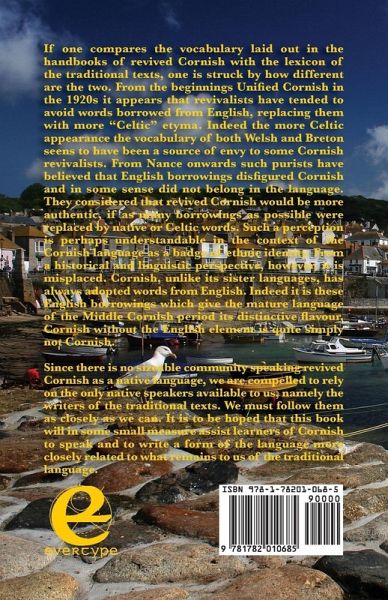If one compares the vocabulary laid out in the handbooks of revived Cornish with the lexicon of the traditional texts, one is struck by how different are the two. From the beginnings Unified Cornish in the 1920s it appears that revivalists have tended to avoid words borrowed from English, replacing them with more "Celtic' etyma". Indeed the more Celtic appearance the vocabulary of both Welsh and Breton seens to have been a source of envy to some Cornish revivalists. From Nance onwards such purists have believed that English borrowings disfigured Cornish and in some sense did not belong in the language. They considered that revived Cornish would be more authentic, if as many borrowings as possible were replaced by native or Celtic words. Such a perception is perhaps understandable in the context of the Cornish language as a badge of ethnic identity. From a historical and linguistic perspective, however, it is misplaced. Cornish, unlike its sister languages, has always adopted words from English. Indeed it is these English borrowings which give the mature language of the Middle Cornish period its distinctive flavour. Cornish without the English element is quite simply not Cornish. Since there is no sizeable community speaking revived Cornish as a native language, we are compelled to rely on the only native speakers available to us, namely the writers of the traditional texts. We must follow them as closely as we can. It is to be hoped that this book will in some small measure assist learners of Cornish to speak and to write a form of the language more closely related to what remains to us of the traditional language.