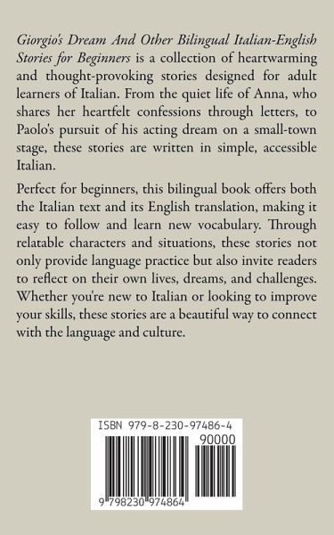 Giorgio's Dream And Other Bilingual Italian-English Stories for Beginners is a collection of heartwarming and thought-provoking stories designed for adult learners of Italian. From the quiet life of Anna, who shares her heartfelt confessions through letters, to Paolo's pursuit of his acting dream on a small-town stage, these stories are written in simple, accessible Italian. Perfect for beginners, this bilingual book offers both the Italian text and its English translation, making it easy to follow and learn new vocabulary. Through relatable characters and situations, these stories not only provide language practice but also invite readers to reflect on their own lives, dreams, and challenges. Whether you're new to Italian or looking to improve your skills, these stories are a beautiful way to connect with the language and culture.