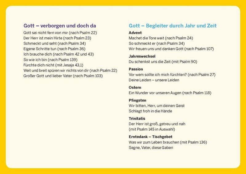 Praktisches Zusatzmaterial für ein religionspädagogisches AngebotGemeinsam mit Kindern beten: Bekannte Psalmen kindgerecht aufbereitetKehrvers zum Teil mit Notensatz zum Singen Unterteilung in vier Schwerpunkte: Gott - Schöpfer der Welt, Gott - meine Zuversicht, Gott - verborgen und doch da, Gott - Begleiter durch Jahr und Zeit