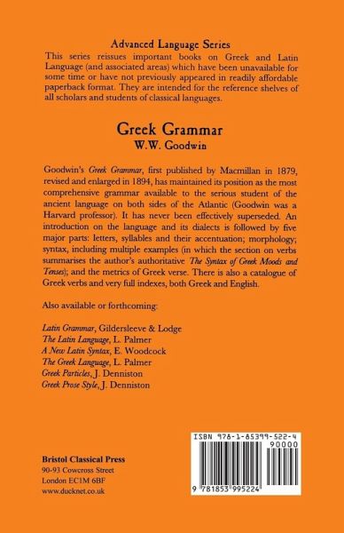 Goodwin's Greek Grammar, first published in 1879 and later revised and enlarged, has maintained its position as the most comprehensive grammar available to the serious student of ancient language on both sides of the Atlantic (Goodwin was a Harvard graduate). It has effectively never been superseded. An introduction to the Greek language and its dialects is followed by five major sections: letters; syllables and their accentuation; morphology; syntax, including multiple examples; and the metrics of Greek verse. There is also a catalogue of Greek verbs and full indexes, both Greek and English.
