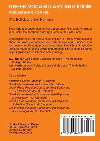 Even forty-four years after its first appearance, this little book remains a very useful tool for those studying Ancient Greek at intermediate level, in the sixth form. Of particular value for translating verse is Part 1, which contains about 850 words in common use in Sophocles and Euripides. For those who still study prose composition, Part 2 is an invaluable treasure-house of useful words and phrases. Part 3 contains some helpful guidelines on Greek idiomatic usage.