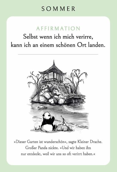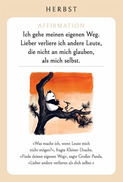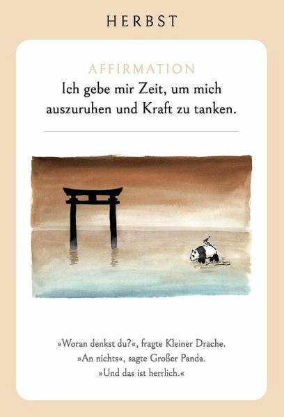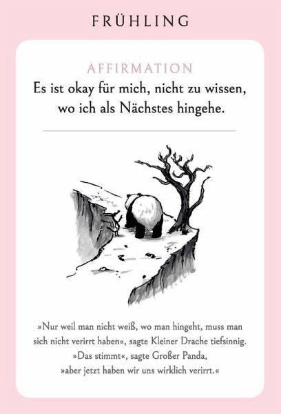Großer Panda und Kleiner Drache, die unzertrennlichen Freunde aus dem gleichnamigen Bestseller von James Norbury, bezaubern nun auch in Form von liebevoll gestalteten Affirmationskarten. Gemeinsam mit ihnen reisen wir durch die vier Jahreszeiten und lernen dabei, im Moment zu leben, Frieden mit dem Ungewissen zu schließen und die nötige Kraft zu finden, um die Hindernisse des Lebens zu überwinden.