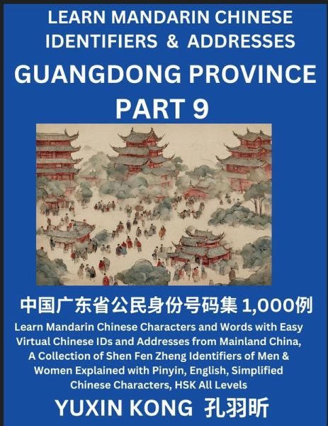 Let's learn Mandarin Chinese while appreciating the Shen Fen Zheng identifiers (¿¿¿¿¿) from different cities and counties of China's Guangdong Province (¿¿¿). This book contains 100 imaginary (virtual) Chinese Shen Fen Zheng of men and women of different Chinese ethnic groups to help the students of Mandarin Chinese language understand the concept of Chinese IDs along with associated non-real addresses, postal codes, and phone numbers. The book series contain 10 books and total 1,000 Chinese IDs. Pinyin and English have been provided for all the addresses. The titles are suitable for the students of HSK all levels.