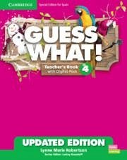 Guess What! special edition for Spain Updated covers the Cambridge Life Competencies. This six-level primary course invites children to explore the world through engaging facts, amazing photography and captivating videos. The full-colour Teacher's Book is interleaved with the Pupil's Book and includes an introduction with a full mapping to the new Key Competencies. It offers step-by-step guidance for each lesson, simple warmers and end of lesson activities; audio scripts and answer keys; photocopiable word cards to match the flashcards; extra games and activities for every lesson. The Digital Pack includes Presentation Plus, a Test Generator and the Teacher's Resource Bank.