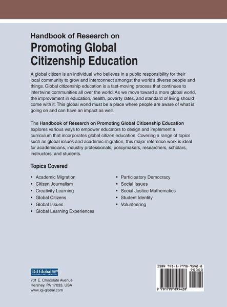 A global citizen is an individual who believes in a public responsibility for their local community to grow and interconnect amongst the world's diverse people and things. Global citizenship education is a fast-moving process that continues to intertwine communities all over the world. As we move toward a more global world, the improvement in education, health, poverty rates, and standard of living should come with it. This global world must be a place where people are aware of what is going on and can have an impact as well. The Handbook of Research on Promoting Global Citizenship Education explores various ways to empower educators to design and implement a curriculum that incorporates global citizen education. Covering a range of topics such as global issues and academic migration, this major reference work is ideal for academicians, industry professionals, policymakers, researchers, scholars, instructors, and students.
