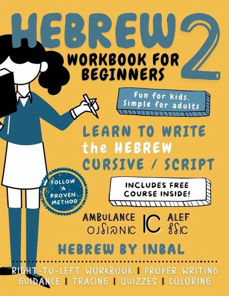 Hebrew 2 Workbook is like no other - thoughtfully designed by a best-selling Israeli Hebrew educator to make learning Hebrew writing simple, rewarding, and effective. Fun for kids. Simple for adults. This workbook teaches the Hebrew Cursive Script alphabet, with a right-to-left format that helps you develop proper habits from the very start. What sets this workbook apart is its unique, simplified approach tailored for English speakers, practical step-by-step guidance, and the author's personal support through a free course packed with resources. What's Inside?A complete introduction to the Hebrew Cursive Script alphabet, including all letter variations. Ample handwriting practice with clear, step-by-step guidance, tracing, and freehand exercises. Practice with letter combinations through dozens of familiar words you already recognize in both Hebrew and English (a completely new set from Hebrew 1), helping you write and reinforce each letter in context. Audio and pronunciation resources: The included free course guides you through the workbook with video tutorials using Hebrew by Inbal's proprietary Phonetic System. You'll practice correct pronunciation alongside the author and master a system that lets you pronounce any Hebrew word confidently on your own. Interactive exercises and games: Engaging activities both in the workbook and in the free course keep learning fun and effective for kids and adults alike. Fun coloring activities and quizzes to reinforce your skills in an enjoyable way. A cut-out Hebrew alphabet chart for easy, on-the-go reference. Additional Resources to Support Your Journey Every Hebrew 2 Workbook comes with a free companion course - a full library of video guidance, tips, and support to help you master handwriting, pronunciation, and the workbook's exercises step by step. This course ensures you get the most out of your learning experience. The First Step in Your Hebrew Journey Hebrew 2 Workbook is part of a complete three-part series completing all your reading and writing skills in Hebrew:Hebrew 1 Workbook: Learn to Write the Hebrew Print Alphabet - for Kids and Adults. Hebrew 2 Workbook: Learn to Write the Hebrew Cursive/Script Alphabet - for Kids and Adults. Hebrew 3 Textbook: Learn to Read by Simplifying the Nikud Vowel System - for Teens and Adults. This 98-page workbook combines a beautiful, easy-to-follow layout with effective, progressive skill-building. Whether you're just starting or building on prior knowledge, you'll make smooth progress while developing clarity and confidence. Continue your Hebrew journey today with the Hebrew 2 Workbook - your step-by-step guide to building essential Hebrew reading and writing skills, with all the resources you need to succeed!