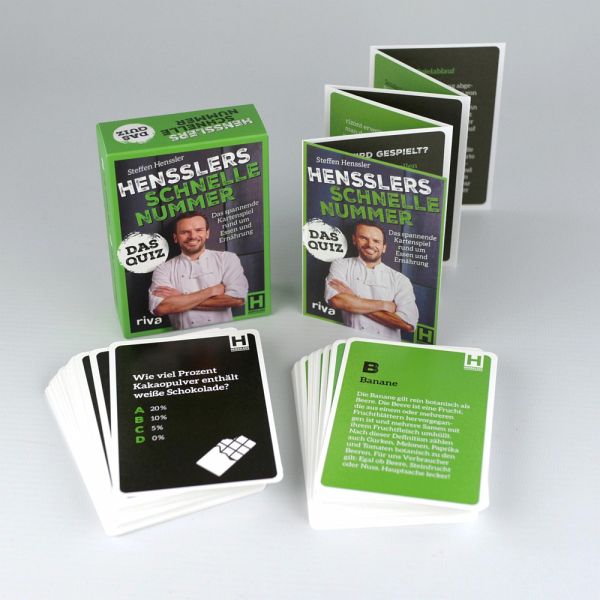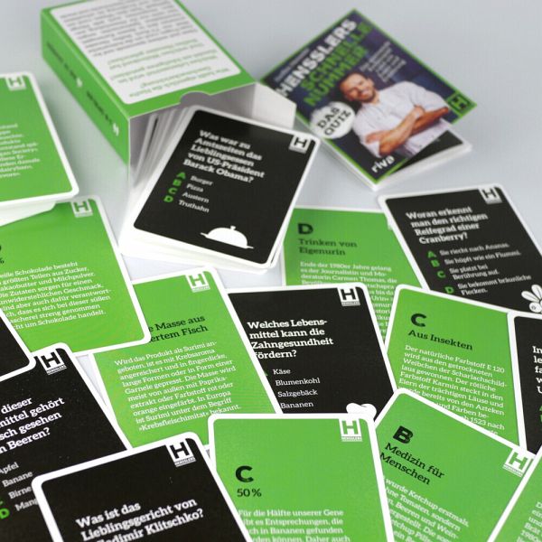 Wie heißt eigentlich die fünfte Geschmacksrichtung? Welches Lebensmittel wird im Handel am häufigsten gestohlen? Und welchen Weltrekord hat Steffen Henssler gebrochen?Diese und weitere spannende und kuriose Fragen rund um die kulinarische Welt von TV-Koch Steffen Henssler erwarten dich in diesem Kartenspiel. Verschiedene Spielvarianten sorgen hier nicht nur für Abwechslung, sondern versprechen auch jede Menge Spielspaß. Teste dein Wissen rund um Essen und Ernährung im schnellsten Quiz des guten Geschmacks und werde zum Food-Profi!