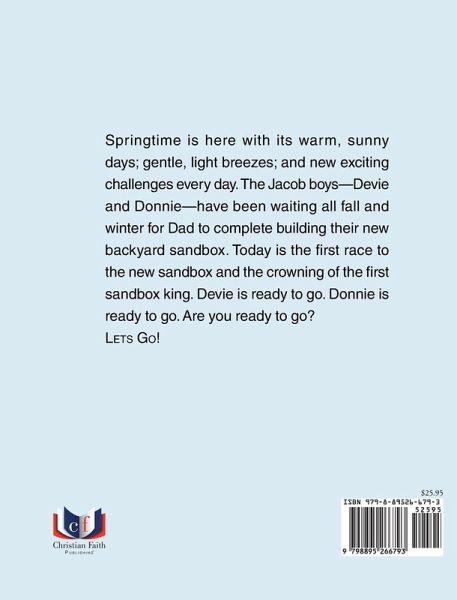 Springtime is here with its warm, sunny days; gentle, light breezes; and new exciting challenges every day. The Jacob boys--Devie and Donnie--have been waiting all fall and winter for Dad to complete building their new backyard sandbox. Today is the first race to the new sandbox and the crowning of the first sandbox king. Devie is ready to go. Donnie is ready to go. Are you ready to go? Let's go!
