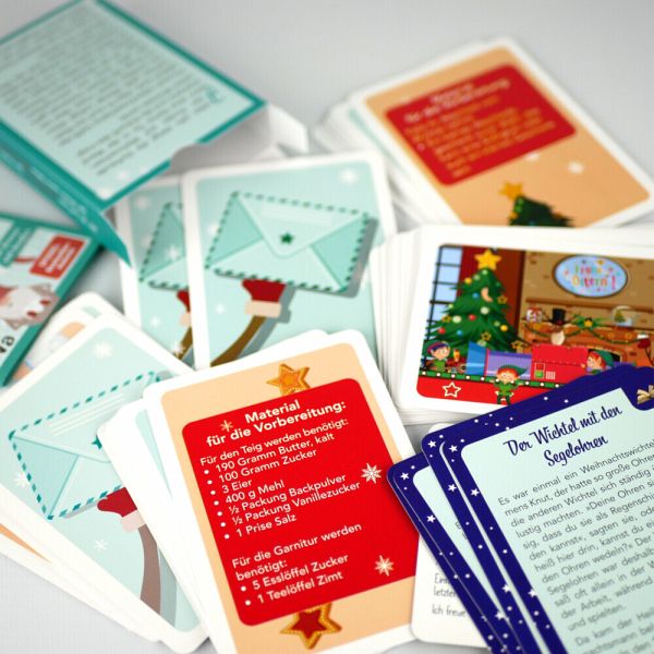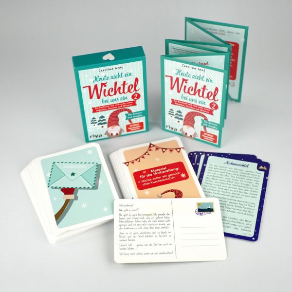 Wenn der Wichtel einziehtJedes Jahr steigt die Vorfreude der Kinder auf Weihnachten, wenn eine kleine Tür in der Wand erscheint und die Ankunft des magischen Wichtels verrät. Für die Eltern heißt das jedoch auch, dass sie sich bis Weihnachten jede Menge lustige Aktionen einfallen lassen müssen. Mit diesem Kartenset geht das ganz leicht.Dieses Kartenset enthält:· Eine ausführliche Anleitung für die Erwachsenen· Rote Anleitungskarten für die Erwachsenen· Blaue Wichtelbriefe für die Kinder· Viele tolle Aufgaben, spannende Rätsel, weihnachtliche Geschichten und vieles mehr· Spaßige Aktionen für drinnen und draußen· Inklusive Postkarte für die Wichtelgrüße nach Weihnachten Egal, ob der Wichtel kleine Streiche spielen, zu Aktivitäten anregen oder ein Rätsel stellen soll, hier ist für jeden von euch etwas dabei. So lässt sich der Wichtel-Trend ganz einfach umsetzen und die Zeit bis Weihnachten vergeht wie im Flug.Die Wichtelbriefe können Tag fürTag vor der Wichteltür platziert werden und sorgen so für eine abwechslungsreiche Adventszeit - und das ganz ohne viel Vorbereitung oder Zeitaufwand.