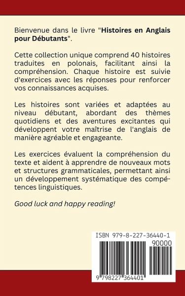Bienvenue dans le livre "Histoires en Anglais pour Débutants". Cette collection unique contient 40 histoires soigneusement sélectionnées pour vous aider à apprendre l'anglais. Chaque histoire est traduite en français, ce qui facilite la compréhension et le suivi de l'intrigue. De plus, après chaque histoire, vous trouverez des exercices avec des réponses pour vous aider à renforcer les connaissances acquises. Les histoires de ce livre varient en thèmes et en niveaux de difficulté, mais elles sont toutes adaptées au niveau débutant. Vous y trouverez des histoires de la vie quotidienne ainsi que des aventures plus palpitantes. Chaque histoire vise à développer votre connaissance de la langue anglaise de manière agréable et engageante. Les exercices qui accompagnent chaque histoire sont conçus pour tester votre compréhension du texte et vous aider à apprendre de nouveaux mots et structures grammaticales. Grâce à eux, vous pourrez développer systématiquement vos compétences linguistiques. J'espère que ce livre deviendra pour vous non seulement un outil d'apprentissage, mais aussi une source de joie et de satisfaction dans la découverte d'une nouvelle langue. Good luck and happy reading!