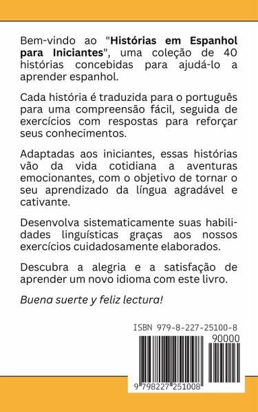 Bem-vindo ao livro "Histórias em Espanhol para Iniciantes". Esta coleção única contém 40 histórias cuidadosamente selecionadas para ajudá-lo a aprender espanhol. Cada história é traduzida para o português, facilitando a compreensão e o acompanhamento da trama. Além disso, após cada história, você encontrará exercícios com respostas para ajudar a reforçar o conhecimento adquirido. As histórias deste livro variam em temas e níveis de dificuldade, mas todas são adaptadas para o nível iniciante. Você encontrará histórias cotidianas, bem como aventuras emocionantes. Cada história tem como objetivo desenvolver seu conhecimento de espanhol de maneira agradável e envolvente. Os exercícios que acompanham cada história são projetados para testar sua compreensão do texto e ajudá-lo a aprender novas palavras e estruturas gramaticais. Graças a esses exercícios, você poderá desenvolver sistematicamente suas habilidades linguísticas. Espero que este livro se torne não apenas uma ferramenta de aprendizado, mas também uma fonte de alegria e satisfação ao descobrir um novo idioma. Buena suerte y feliz lectura!