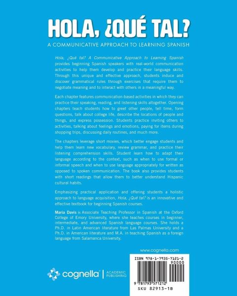 Hola, ¿Qué tal? A Communicative Approach to Learning Spanish provides beginning Spanish speakers with real-world communication activities to help them develop and practice their language skills. Through this unique and effective approach, students induce and discover grammatical rules through exercises that require them to negotiate meaning and to interact with others in a meaningful way. Each chapter features communication-based activities in which they can practice their speaking, reading, and listening skills altogether. Opening chapters teach students how to greet other people, tell time, form questions, talk about college life, describe the locations of people and things, and express possession. Students practice inviting others to activities, talking about feelings and emotions, paying for items during shopping trips, discussing daily routines, and much more. The chapters leverage short movies, which better engage students and help them learn new vocabulary, review grammar, and practice their listening comprehension skills. Student learn how to adapt their language according to the context, such as when to use formal or informal speech and when to use language appropriately for written as opposed to spoken communication. The book also provides students with short readings that allow them to better understand Hispanic cultural habits. Emphasizing practical application and offering students a holistic approach to language acquisition, Hola, ¿Qué tal? is an innovative and effective textbook for beginning Spanish courses.