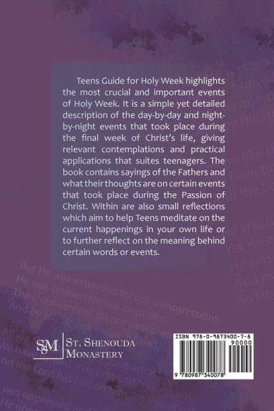Teens Guide for Holy Week highlights the most crucial and important events of Holy Week. It is a simple yet detailed description of the day-by-day and night-by-night events that took place during the final week of Christ's life, giving relevant contemplations and practical applications that suites teenagers. The book contains sayings of the Fathers and what their thoughts are on certain events that took place during the Passion of Christ. Within are also small reflections which aim to help Teens meditate on the current happenings in your own life or to further reflect on the meaning behind certain words or events.