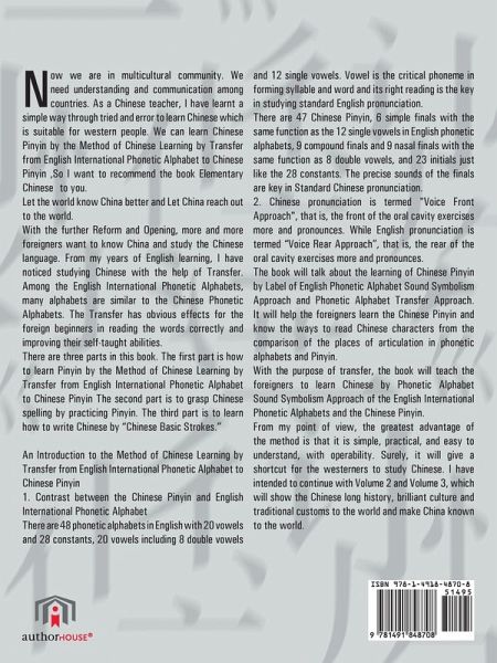 Now we are in multicultural community. We need understanding and communication among countries. As a Chinese teacher, I have learnt a simple way through tried and error to learn Chinese which is suitable for western people. We can learn Chinese Pinyin by the Method of Chinese Learning by Transfer from English International Phonetic Alphabet to Chinese Pinyin ,So I want to recommend the book¿Elementary Chinese¿ to you. Let the world know China better and Let China reach out to the world. With the further Reform and Opening, more and more foreigners want to know China and study the Chinese language. From my years of English learning, I have noticed studying Chinese with the help of Transfer. Among the English International Phonetic Alphabets, many alphabets are similar to the Chinese Phonetic Alphabets. The Transfer has obvious effects for the foreign beginners in reading the words correctly and improving their self-taught abilities. There are three parts in this book. The first part is how to learn Pinyin by the Method of Chinese Learning by Transfer from English International Phonetic Alphabet to Chinese Pinyin¿The second part is to grasp Chinese spelling by practicing Pinyin. The third part is to learn how to write Chinese by "Chinese Basic Strokes." An Introduction to the Method of Chinese Learning by Transfer from English International Phonetic Alphabet to Chinese Pinyin 1. Contrast between the Chinese Pinyin and English International Phonetic Alphabet There are 48 phonetic alphabets in English with 20 vowels and 28 constants, 20 vowels including 8 double vowels and 12 single vowels. Vowel is the critical phoneme in forming syllable and word and its right reading is the key in studying standard English pronunciation. There are 47 Chinese Pinyin, 6 simple finals with the same function as the 12 single vowels in English phonetic alphabets, 9 compound finals and 9 nasal finals with the same function as 8 double vowels, and 23 initials just like the 28 constants. The precise sounds of the finals are key in Standard Chinese pronunciation. 2. Chinese pronunciation is termed "Voice Front Approach", that is, the front of the oral cavity exercises more and pronounces. While English pronunciation is termed "Voice Rear Approach", that is, the rear of the oral cavity exercises more and pronounces. The book will talk about the learning of Chinese Pinyin by Label of English Phonetic Alphabet Sound Symbolism Approach and Phonetic Alphabet Transfer Approach. It will help the foreigners learn the Chinese Pinyin and know the ways to read Chinese characters from the comparison of the places of articulation in phonetic alphabets and Pinyin. With the purpose of transfer, the book will teach the foreigners to learn Chinese by Phonetic Alphabet Sound Symbolism Approach of the English International Phonetic Alphabets and the Chinese Pinyin. From my point of view, the greatest advantage of the method is that it is simple, practical, and easy to understand, with operability. Surely, it will give a shortcut for the westerners to study Chinese. I have intended to continue with Volume 2 and Volume 3, which will show the Chinese long history, brilliant culture and traditional customs to the world and make China known to the world.