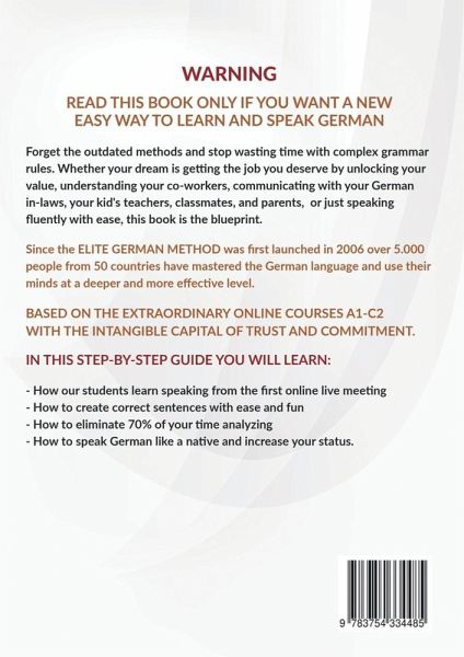 Since the ELITE GERMAN METHOD was first launched in 2006over 5.000 people from 50 countries have mastered the German language and use their minds at a deeper and more effective level. BASED ON EXTRAORDINARY LIVE ONLINE COURSES A1 C2 WITH THE INTANGIBLE CAPITAL OF TRUST & COMMITMENT IN THIS STEP-BY-STEP GUIDE YOU WILL LEARNHow our students learn speaking from the first online live meetingHow to create correct sentences with ease and funHow to eliminate 70% of analysisHow to speak German like a native and increase your status.Forget the outdated methods and stop wasting time with complex grammar rulesWhether your dream is getting the job you deserve by unlocking your value, understanding your co-workers, communicating with your German in-laws,your kid's teachers, classmates, and parents, or just speaking fluently with ease, this book is the blueprint.www.elitegerman.com