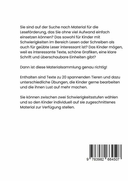 'Huhn und so' richtet sich sowohl an Lehrkräfte, die das Material im Unterricht einsetzen, als auch an Eltern, die ihre Kinder zu Hause unterstützen wollen. Auch in der sprach- oder lerntherapeutischen Arbeit kann es eingesetzt werden.Bevor ein komplexer Text tatsächlich verstanden wird und der Inhalt sinnhaft erfasst werden kann, braucht es einige Voraussetzungen und Entwicklungsschritte:- einen geübten Umgang mit Sprache und Schriftsprache und die Fähigkeit, mit Sprache spielen zu können; man nennt das auch phonologische Bewusstheit- bekannte Wörter als Ganzwort schnell erkennen können (logografisches Lesen) und einen sogenannten Sichtwortschatz haben- Wörter in Silben zerlegen können, später dann das Erkennen von Wortbausteinen wie Vorsilben, Morphemen, Endungen usw., das heißt Wortstrukturen erkennen können- gute Lesegenauigkeit, das heißt Wörter möglichst richtig erfassen und die Wörter auch im Satzzusammenhang richtig betonen können- gute Leseflüssigkeit bzw. Lesegeschwindigkeit (gemessen in Wörtern per Minute).Erst, wenn diese Fähigkeiten vorhanden sind, können wir davon ausgehen, dass das Umsetzen von Schrift in Sprache, also der Leseprozess an sich, keine hohe kognitive Leistung mehr erfordert und die Kinder sich mit dem Inhalt des Gelesenen beschäftigen können.Das vorliegende Material setzt möglichst an einem Punkt an, an dem die phonologische Bewusstheit ausgebildet ist, ein gewisser Sichtwortschatz vorhanden ist und Wörter in Silben zerlegt werden können.Nicht jeder Text ist für Leseanfänger geeignet.Worauf müssen wir also achten, wenn wir Lesekompetenzen entwickeln und stärken wollen?- Freude am Lesen wecken durch kurze, spannende und lebensweltorientierte Texte; Vorwissen zu den Texten sammeln und besprechen- Neugier aufgreifen und Verstehen fördern, indem nicht nur gelesen wird, sondern auch über die Texte gesprochen oder zusätzlich zu den Themen geforscht wird- durch wiederholtes Üben, Vorlesen, Tandem- und Chorlesen o.ä. das Lesen flüssiger und schneller machen, so dass das Kind es als weniger anstrengend empfindet- neue Wörter und Begriffe einführen und üben, damit der Wortschatz vergrößert wird und der sprachliche Ausdruck gestärkt wird- Material anbieten, dass dem Niveau des Kindes entspricht und das es selbstständig bearbeiten kann; das stärkt die Selbstständigkeit und das Selbstvertrauen- die Fähigkeiten des Kindes gut einschätzen, um es weder zu überfordern, noch zu unterfordern; das Material daraufhin sorgfältig auswählen.'Huhn und so' setzt genau da an. Das Material ist speziell dafür entwickelt worden, junge Lesende auf ihrem Weg zu unterstützen, besser und flüssiger lesen zu lernen.In 'Huhn und so' finden Sie unterhaltsame Sachtexte über verschiedene Tiere. Den Text gibt es auch noch einmal in 'einfacher Sprache', um das Verständnis zu erleichtern und sicherzustellen, dass alle Kinder, unabhängig von ihrem aktuellen Lesestand, die Informationen erfassen können.Um das Gelesene zu vertiefen und die Lesekompetenzen weiter zu stärken, gibt es zu jedem Text abwechslungsreiche Übungen. Diese Übungen sind darauf ausgerichtet, verschiedene Aspekte des Lesens zu fördern. Sie sind so gestaltet, dass sie je nach den individuellen Bedürfnissen und Fähigkeiten der Kinder ausgewählt werden können (Binnendifferenzierung). So wird sichergestellt, dass jedes Kind in seinem eigenen Tempo lernen und Fortschritte machen kann.