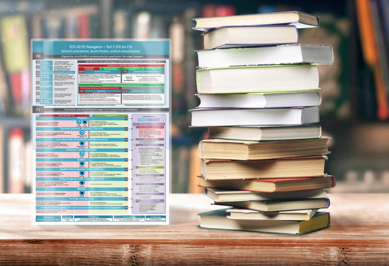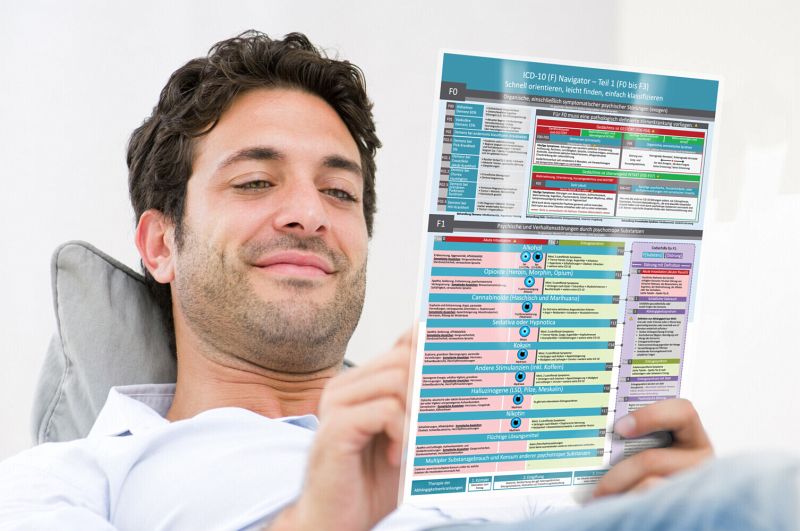 Der ICD-10 Navigator (Teil 1) bietet Ihnen auf 2 Seiten eine Übersicht der ersten 4 Kapitel (F0 - F3) in anschaulichen Info-Grafiken. Sie finden wesentliche Informationen bezüglich der Krankheitsbeschreibungen, Symptombilder und häufigsten Behandlungsansätzen.