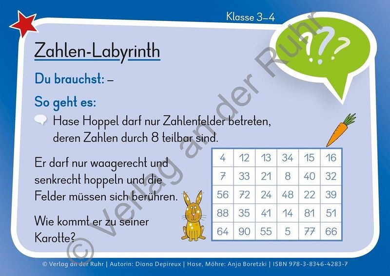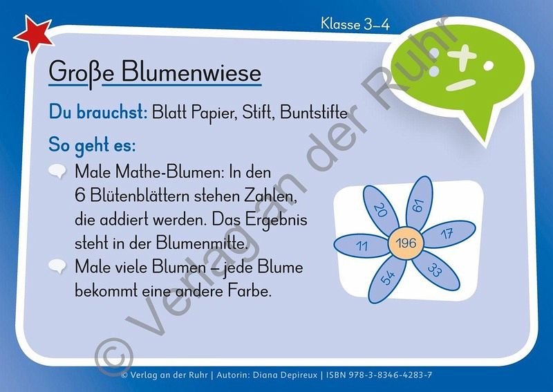 Unterrichtsmaterial (Karteikarten) für Lehrer und Lehrerinnen an Grundschulen, Fächer: Mathematik, Klasse 3-4 +++ "Ich bin fertig! Was soll ich machen?" - Sicher kennen Sie als Lehrkraft diese Frage, die Kinder stellen, wenn sie in der Stunde einfach mehr "Futter" brauchen. Mit dieser Differenzierungskartei versorgen Sie Ihre schnellen Schüler und Schülerinnen für 5-10 Minuten mit motivierenden Angeboten. Das Mandala hat ausgesorgt! Die Karteikarten in DIN A6 lassen sich einfach handhaben und sind ideal für die stille Einzelarbeit. Mithilfe der Logos auf den Karten zu den Themen "Zahldarstellung", "Grundrechenarten", "Sachaufgaben und Größen", "Geometrie" und "Knobeleien" können Sie den Kindern zielgenau Zusatzübungen bereitstellen. Die Karten sind zusätzlich in die Klassenstufen 3 und 4 eingeteilt, sodass Ihre Schüler und Schülerinnen weder unter- noch überfordert werden. Die Ideensammlung umfasst 80 Karten, die den Kindern mit kreativen Impulsen helfen, wichtige mathematische Themen spaßvoll zu vertiefen. Die Kinder können sich selbstständig eine Aufgabe nehmen und sie allein bearbeiten. Während die "Schnellen" also z. B. darüber knobeln, welche Zahl halb so groß ist wie die Hälfte von 3 · 8, können Sie sich um die Kinder kümmern, die eben noch nicht fertig sind.