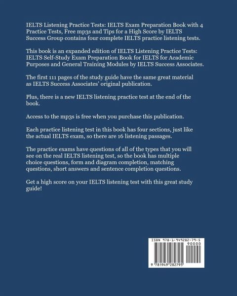 IELTS Listening Practice Tests: IELTS Exam Preparation Book with 4 Practice Tests, Free mp3s and Tips for a High Score by IELTS Success Group contains four complete IELTS practice listening tests. This book is an expanded edition of IELTS Listening Practice Tests: IELTS Self-Study Exam Preparation Book for IELTS for Academic Purposes and General Training Modules by IELTS Success Associates. The first 111 pages of the study guide have the same great material as IELTS Success Associates' original publication. Plus, there is a new IELTS listening practice test at the end of the book. Access to the mp3s is free when you purchase this publication. Each practice listening test in this book has four sections, just like the actual IELTS exam, so there are 16 listening passages. The practice exams have questions of all of the types that you will see on the real IELTS listening test, so the book has multiple choice questions, form and diagram completion, matching questions, short answers and sentence completion questions. The tips at the beginning of the book explain the format of the IELTS listening test and tell you what to expect on your exam day. Practice Listening Test 1 in the publication is in tutorial mode, so it includes tips and suggestions at the beginning of each section to give you strategies to help you answer all of the types of questions on the listening tests. There is a complete answer key with in-depth explanations for each answer, so that you can understand why each answer is the correct one. The explanations give you additional tips to help you improve your test-taking technique. The book also includes the complete scripts for each of the listening tests, which you should read after completing each of the practice tests, to help improve your knowledge of the vocabulary and idioms included on the IELTS exam. Get a high score on your IELTS listening test with this great study guide!¿