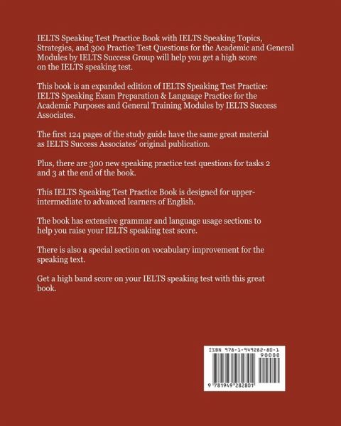 IELTS Speaking Test Practice Book with IELTS Speaking Topics, Strategies, and 300 Practice Test Questions for the Academic and General Modules by IELTS Success Group will help you get a high score on the IELTS speaking test. This book is an expanded edition of IELTS Speaking Test Practice: IELTS Speaking Exam Preparation & Language Practice for the Academic Purposes and General Training Modules by IELTS Success Associates. The first 124 pages of the study guide have the same great material as IELTS Success Associates' original publication. Plus, there are 300 new speaking practice test questions for tasks 2 and 3 at the end of the book. This IELTS Speaking Test Practice Book is designed for upper-intermediate to advanced learners of English. The book has extensive grammar and language usage sections to help you raise your IELTS speaking test score. This study guide is conveniently organized into 8 parts: PART 1: The study guide begins with an overview of the format of the IELTS speaking test and provides you with tips for better performance on your exam. PART 2: You will learn what aspects of grammar and what types of sentence constructions examiners are looking for in each part of your interview. PART 3: There are exercises teaching you how to use conditional sentences on the IELTS speaking tasks. PART 4: The book then shows a complete sample speaking exam, with three speaking tasks. There are tips for preparing for each of the tasks, with in-depth explanations. Sample responses for each task with exercises and explanations are also provided. PART 5: Useful conversational phrases for you to practice for your speaking test. PART 6: There is also a special section on vocabulary improvement for the speaking text. PART 7: The book has three more complete speaking practice exams, with model responses for each of the tasks and teacher's comments on each response. PART 8: There are 300 additional speaking practice tests at the end of the book for tasks 2 and 3 of the speaking test to provide you with further practice for the exam. Get a high band score on your IELTS speaking test with this great book!