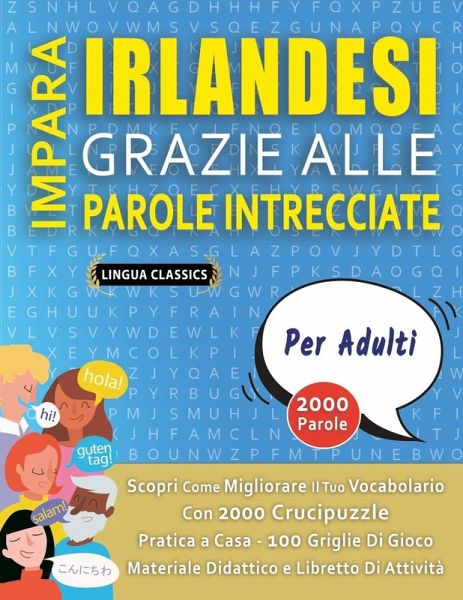 * IMPARA IRLANDESI DIVERTENDOTI - AMPLIA IL TUO VOCABOLARIO FACILMENTE! Studiare Con Le Parole Intrecciate È Una Tecnica Di Apprendimento Efficace Usata Nelle Scuole per Migliorare Il Vocabolario - Un Grande Gioco per Stimolare L'Apprendimento! Questa serie di libri è stata progettata per adattarsi al livello di ogni persona. Che siate un principiante, un livello intermedio o che stiate aiutando vostro figlio a imparare una nuova lingua, troverete il libro giusto per le vostre esigenze. Come? Un ottimo complemento per chiunque impari una lingua. Migliorate il vostro livello con un'attività stimolante! Con +40 ore di divertimento, scoprirete e imparerete a ricordare più di 2000 parole. UN MODO STIMOLANTE PER STUDIARE: - VOCABOLARIO SPECIFICO PER ETÀ E LIVELLO: Goditi una selezione di +2000 parole - IMPARARE ATTIVAMENTE: Viene fornito uno spazio per incoraggiare il lettore a fare la propria traduzione - GRANDE FORMATO PUZZLE: Progettato per la migliore leggibilità possibile - SOLUZIONE CHIARA: Soluzioni in un formato chiaro e semplice - DIVERTENTE: Abbastanza difficile da essere impegnativo, abbastanza facile da creare dipendenza DIVERTITEVI A SVILUPPARE LE VOSTRE COMPETENZE LINGUISTICHE: - Pratica Le parole intrecciate rendono la sfida dell'apprendimento di una lingua un piacere! - Progresso Imparate con un vocabolario comune adattato alle vostre capacità. - Ricordate ciò che imparate Una tecnica di apprendimento attivo per aumentare il vostro vocabolario. - Raggiungi i tuoi obiettivi Non esercitatevi solo passivamente. Cercate le traduzioni di nuove parole - trovale nel Puzzle - aggiungile al tuo vocabolario! DISPONIBILE IN OLTRE 50 LINGUE PER: - Principianti - Intermediario - Avanzato - Bambini dai 6 agli 8 anni - Bambini dagli 8 ai 10 anni - Bambini dai 9 ai 12 anni - Adolescenti - Adulti - Anziani Scopri la nostra collezione completa - cerca ""LINGUA CLASSICS"" e scopri nuovi libri per migliorare te stesso - un regalo infallibile per la tua famiglia e i tuoi amici! Goditi subito questa divertente esperienza di apprendimento - Fai amicizia con una nuova lingua facilmente! ------- [ENGLISH] ------- Note: Some content in English might be missing due to length restrictions. * LEARN IRISH WHILE HAVING FUN - BUILD VOCABULARY EASILY! Word Searches Are an Effective Technique Used in Schools to Increase Vocabulary - It’s an Ideal Game to Stimulate Learning! This book series has been tailored to each person’s specific level. Whether you are a beginner, advanced, or helping your child learn a new language you’ll find the right book for your needs. Why? It’s a great complement for anyone learning a language. Make it easy with an encouraging activity! With +40 hours of entertainment, you will discover and be able to retain over 2000 words: AN EXCITING STUDY COMPANION WITH: - AGE & LEVEL SPECIFIC VOCABULARY: Enjoy a curated selection of +2000 adapted words - ACTIVE LEARNING: Space provided beside each term to encourage the reader to self-translate - PUZZLES IN FULL PAGE FORMAT: Designed for the best readability possible. - BOOK PREVIEW AVAILABLE: No surprises, click on the cover to Look inside the book - EASY MATCH SOLUT...