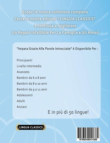 * IMPARA L'INDONESIANO DIVERTENDOTI - AMPLIA IL TUO VOCABOLARIO FACILMENTE! Studiare Con Le Parole Intrecciate È Una Tecnica Di Apprendimento Efficace Usata Nelle Scuole per Migliorare Il Vocabolario - Un Grande Gioco per Stimolare L'Apprendimento! Questa serie di libri è stata progettata per adattarsi al livello di ogni persona. Che siate un principiante, un livello intermedio o che stiate aiutando vostro figlio a imparare una nuova lingua, troverete il libro giusto per le vostre esigenze. Come? Un ottimo complemento per chiunque impari una lingua. Migliorate il vostro livello con un'attività stimolante! Con +40 ore di divertimento, scoprirete e imparerete a ricordare più di 2000 parole. UN MODO STIMOLANTE PER STUDIARE: - VOCABOLARIO SPECIFICO PER ETÀ E LIVELLO: Goditi una selezione di +2000 parole - IMPARARE ATTIVAMENTE: Viene fornito uno spazio per incoraggiare il lettore a fare la propria traduzione - GRANDE FORMATO PUZZLE: Progettato per la migliore leggibilità possibile - SOLUZIONE CHIARA: Soluzioni in un formato chiaro e semplice - DIVERTENTE: Abbastanza difficile da essere impegnativo, abbastanza facile da creare dipendenza DIVERTITEVI A SVILUPPARE LE VOSTRE COMPETENZE LINGUISTICHE: - Pratica Le parole intrecciate rendono la sfida dell'apprendimento di una lingua un piacere! - Progresso Imparate con un vocabolario comune adattato alle vostre capacità. - Ricordate ciò che imparate Una tecnica di apprendimento attivo per aumentare il vostro vocabolario. - Raggiungi i tuoi obiettivi Non esercitatevi solo passivamente. Cercate le traduzioni di nuove parole - trovale nel Puzzle - aggiungile al tuo vocabolario! DISPONIBILE IN OLTRE 50 LINGUE PER: - Principianti - Intermediario - Avanzato - Bambini dai 6 agli 8 anni - Bambini dagli 8 ai 10 anni - Bambini dai 9 ai 12 anni - Adolescenti - Adulti - Anziani Scopri la nostra collezione completa - cerca ""LINGUA CLASSICS"" e scopri nuovi libri per migliorare te stesso - un regalo infallibile per la tua famiglia e i tuoi amici! Goditi subito questa divertente esperienza di apprendimento - Fai amicizia con una nuova lingua facilmente! ------- [ENGLISH] ------- Note: Some content in English might be missing due to length restrictions. * LEARN INDONESIAN WHILE HAVING FUN - BUILD VOCABULARY EASILY! Word Searches Are an Effective Technique Used in Schools to Increase Vocabulary - It’s an Ideal Game to Stimulate Learning! This book series has been tailored to each person’s specific level. Whether you are a beginner, advanced, or helping your child learn a new language you’ll find the right book for your needs. Why? It’s a great complement for anyone learning a language. Make it easy with an encouraging activity! With +40 hours of entertainment, you will discover and be able to retain over 2000 words: AN EXCITING STUDY COMPANION WITH: - AGE & LEVEL SPECIFIC VOCABULARY: Enjoy a curated selection of +2000 adapted words - ACTIVE LEARNING: Space provided beside each term to encourage the reader to self-translate - PUZZLES IN FULL PAGE FORMAT: Designed for the best readability possible. - BOOK PREVIEW AVAILABLE: No surprises, click on the cover to Look inside the book - EASY MA...