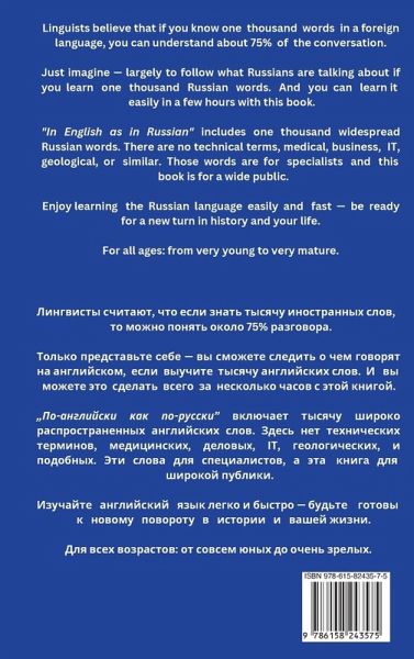 Linguists believe that if you know one thousand words in a foreign language you can understand about 75% of the conversation. Just imagine - largely to follow what Russians are talking about if you learn one thousand Russian words. And you can learn it easily in a few hours with this book. "In English as in Russian" includes one thousand widespread Russian words. There are no technical terms, medical, business, IT, geological, or similar. Those words are for specialists and this book is for a wide public. Enjoy learning the Russian language easily and fast - be ready for a new turn in history and your life. For all ages: from very young to very mature. ¿¿¿¿¿¿¿¿¿ ¿¿¿¿¿¿¿, ¿¿¿ ¿¿¿¿ ¿¿¿¿¿ ¿¿¿¿¿¿ ¿¿¿¿¿¿¿¿¿¿x ¿¿¿¿, ¿¿ ¿¿¿¿¿ ¿¿¿¿¿¿ ¿¿¿¿¿ 75% ¿¿¿¿¿¿¿¿¿. ¿¿¿¿¿¿ ¿¿¿¿¿¿¿¿¿¿¿ ce¿e - ¿¿ ¿¿¿¿¿¿¿ ¿¿¿¿¿¿¿ o ¿e¿ ¿¿¿¿¿¿¿ ¿¿ ¿¿¿¿¿¿¿¿¿¿, ¿¿¿¿ ¿¿¿¿¿¿¿ ¿¿¿¿¿¿ ¿¿¿¿¿¿¿¿¿¿ ¿¿¿¿. ¿ ¿¿ ¿¿¿¿¿¿ ¿¿¿ ¿¿¿¿¿¿¿ ¿¿¿¿¿ ¿¿ ¿¿¿¿¿¿¿¿¿ ¿¿¿¿¿ ¿ ¿¿¿¿ ¿¿¿¿ö. "¿¿-¿¿¿¿¿¿¿¿¿ ¿¿¿ ¿¿-¿¿¿¿¿¿" ¿¿¿¿¿¿¿¿ ¿¿¿¿¿¿ ¿¿¿¿¿¿ ¿¿¿¿¿¿¿¿¿¿¿¿¿¿¿¿ ¿¿¿¿¿¿¿¿¿¿ ¿¿¿¿. ¿¿¿¿¿ ¿¿¿ ¿¿¿¿¿¿¿¿¿¿¿ ¿¿¿¿¿¿¿¿, ¿¿¿¿¿¿¿¿¿¿x, ¿¿¿¿¿¿x, IT, ¿¿¿¿¿¿¿¿¿¿¿¿x, ¿ ¿¿¿¿¿¿¿x. ¿¿¿ ¿¿¿¿¿ ¿¿¿ ¿¿¿¿¿¿¿¿¿¿¿¿, ¿ ¿¿¿ ¿¿¿¿a ¿¿¿ ¿¿¿¿¿¿¿ ¿¿¿¿¿¿¿. ¿¿¿¿¿¿¿¿ ¿¿¿¿¿¿¿¿¿¿ ¿¿¿¿ ¿¿¿¿¿ ¿ ¿¿¿¿¿¿ - ¿¿¿¿¿¿ ¿¿¿¿¿¿ ¿ ¿¿¿¿¿¿ ¿¿¿¿¿¿¿¿ ¿ ¿¿¿¿¿¿¿ ¿ ¿¿¿¿¿ ¿¿¿¿¿. ¿¿¿ ¿¿¿¿ ¿¿¿¿¿¿¿¿¿: ¿¿ ¿¿¿¿¿¿ ¿¿¿¿ ¿¿ ¿¿¿¿¿ ¿¿¿¿¿¿.