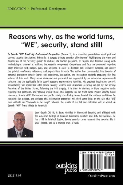The book, In Guards ¿WE¿ Trust!! My professional perspective (Volume I), sheds light on the subject of security in general, but places a spotlight on the ¿Traditional Private Security Guard.¿ While doing so it was necessary to address an assortment of entities viewed by the public as; enforcers, protectors, observers, and reporters. When it comes to the word ¿Security¿; assumption, clarification, boundaries, limitations, and authority are often questioned. To dispel myths and stigmas about certain images given to the traditional security guard, the writer has infused data related to many other protective entities. Visible emerging trends in security are focused mainly on technology, and devices. These tech gadgets introduced are highly compatible with a youthful mindset, and would show greater value, if ¿WE¿ market them towards enhancing human capabilities, i.e. ¿smart cards ¿smart guards!¿ The public¿s costs in dollars and cents for security service warrants our assurance. Unfortunately, the negative stigma of security being a low paying job reduces public confidence. ¿Truth-be-known,¿ the greatest cost, is paid for by not having adequate security. There has been public criticism regarding security¿s non-reaction or non-intervention during certain situations when security persons had been present. The most frequent question asked after an incident is where was security? Following the 911 tragedy, the President of the United States verbalized Private Security Guards as being subpar, ¿nationally.¿ Did ¿WE¿ defend ourselves? This was a significant opportunity for the Private Security Industry to cohesively reach out for help! There have been other significant emotional events in the US such as, natural disasters, incidents at schools, etc. where security presence would have been a useful and relevant resource had ¿WE¿ been specifically trained, programmed and utilized accordingly. In this book ¿WE¿ pertains to owners, performers, providers, and users of private guard services. Prevention is the main foundation of security service¿s objective. However, the predators¿ mindset is circumvention and invasion which requires diverse, as well as specific approaches in providing resilient security functioning. Assurance in meeting these challenges warrant absolute expectations when the cry goes out for, S-E-C-U-R-I-T-Y, and ¿faith¿ In Guards ¿WE¿ Trust!