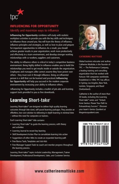 Influencing For Opportunity: Identify and Maximize Ways to Influence Influencing for Opportunity combines self-study with realistic workplace activities to provide you with the key skills and techniques to influence those around you. You will learn the theory of influence, influence principles and strategies, as well as how to plan and prepare for important opportunities to influence. As a result, you should achieve greater results in your organization, work more productively and effectively in a team environment, and develop stronger working relationships with co-workers, suppliers and…mehr