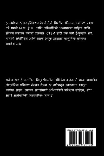 Information & Communication Technology System Maintenance First Year ICTSM is a simple e-Book for ITI & Engineering Course Information & Communication Technology System Maintenance ICTSM. It contains objective questions with underlined & bold correct answers MCQ covering all topics including all about the latest & Important about safety and environment, use of fire extinguishers, Resistors and Soldering, De-soldering practice,Inductors, measure Inductance and uses of Transformer, Capacitor, types of Transistors and use it as Amplifiers, voltage, frequency, modulation of modulator/ transmitter. Working with some important Mechanical, Electrical & Electronics Accessories used in information communication system, Word Processing and Spreadsheet Software, hardware components of Desktop Computer., Operating System and all other application software, hardware components of Laptop PC. Replace/ install SMPS and troubleshoot, memory devices, chips, Modem, System Resources, Add on Cards, Cables & Connectors, Tablet/ Smart Devices, Networking System using various network devices, configuration of Windows Server. Installation, configuration of DNS, Routing and user account customization. Configuration of Server and managing Server Network security and Infrastructure. Installation and basic configuration of Linux server and lots more.