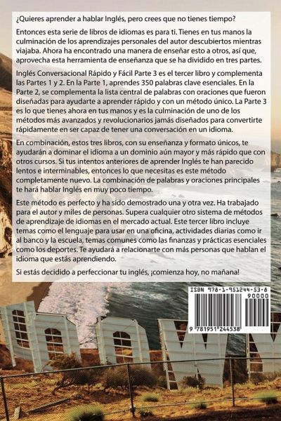 DESCARGO DE RESPONSABILIDAD: ESTE LIBRO ESTÁ DISEÑADO PARA AQUELLOS QUE YA TIENEN CONOCIMIENTOS PREVIOS EN LA LECTURA Y LA PRONUNCIACIÓN DE LA LENGUA INGLESA ¿Quieres aprender a hablar inglés pero crees que no tienes tiempo? Entonces esta serie de libros de idiomas es para ti. Puedes tener en sus manos es la culminación de los aprendizajes personales del autor descubiertos mientras viajaba. Ahora ha encontrado una manera de enseñar esto a otros, así que aproveche esta herramienta de enseñanza que se ha dividido en tres partes. Inglés Conversacional Rápido y Fácil La Parte 3 es el tercer libro y complementa las Partes 1 y 2. En la Parte 1, aprende 350 palabras clave esenciales. En la Parte 2, complementa la lista central de palabras con oraciones que fueron diseñadas para ayudarlo a aprender rápido y con un método único. La Parte 3 es lo que ahora tiene en sus manos, y es la culminación de uno de los métodos más avanzados y revolucionarios jamás diseñados para convertirse rápidamente en una conversación en un idioma. En combinación, estos tres libros, con su enseñanza y formato únicos, lo ayudarán a dominar el idioma a un dominio aún mayor y más rápido que con otros cursos. Si sus intentos anteriores de aprender inglés le han parecido lentos e interminables, entonces lo que necesita es este método completamente nuevo. La combinación de palabras y oraciones principales te hará hablar inglés en muy poco tiempo. Este método es perfecto y se ha demostrado una y otra vez. Ha trabajado para el autor y miles de otros. Supera cualquier otro sistema de métodos de aprendizaje de idiomas en el mercado actual. Este tercer libro incluye temas como el lenguaje para usar en una oficina, actividades diarias como ir al banco y la escuela, temas comunes como las finanzas y prácticas esenciales como los deportes. Le ayudará a relacionarse con más personas que hablan el idioma que está aprendiendo. Si estás decidido a perfeccionar tu inglés, ¡comienza hoy, no mañana!